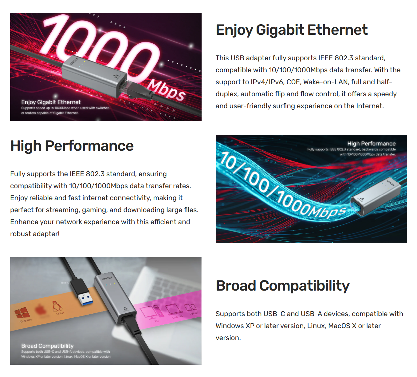 ✅ รองรับ Wake-on-LAN, full/half-duplex, การสลับสายอัตโนมัติ (automatic flip) และการควบคุมการไหลของข้อมูล (flow control)