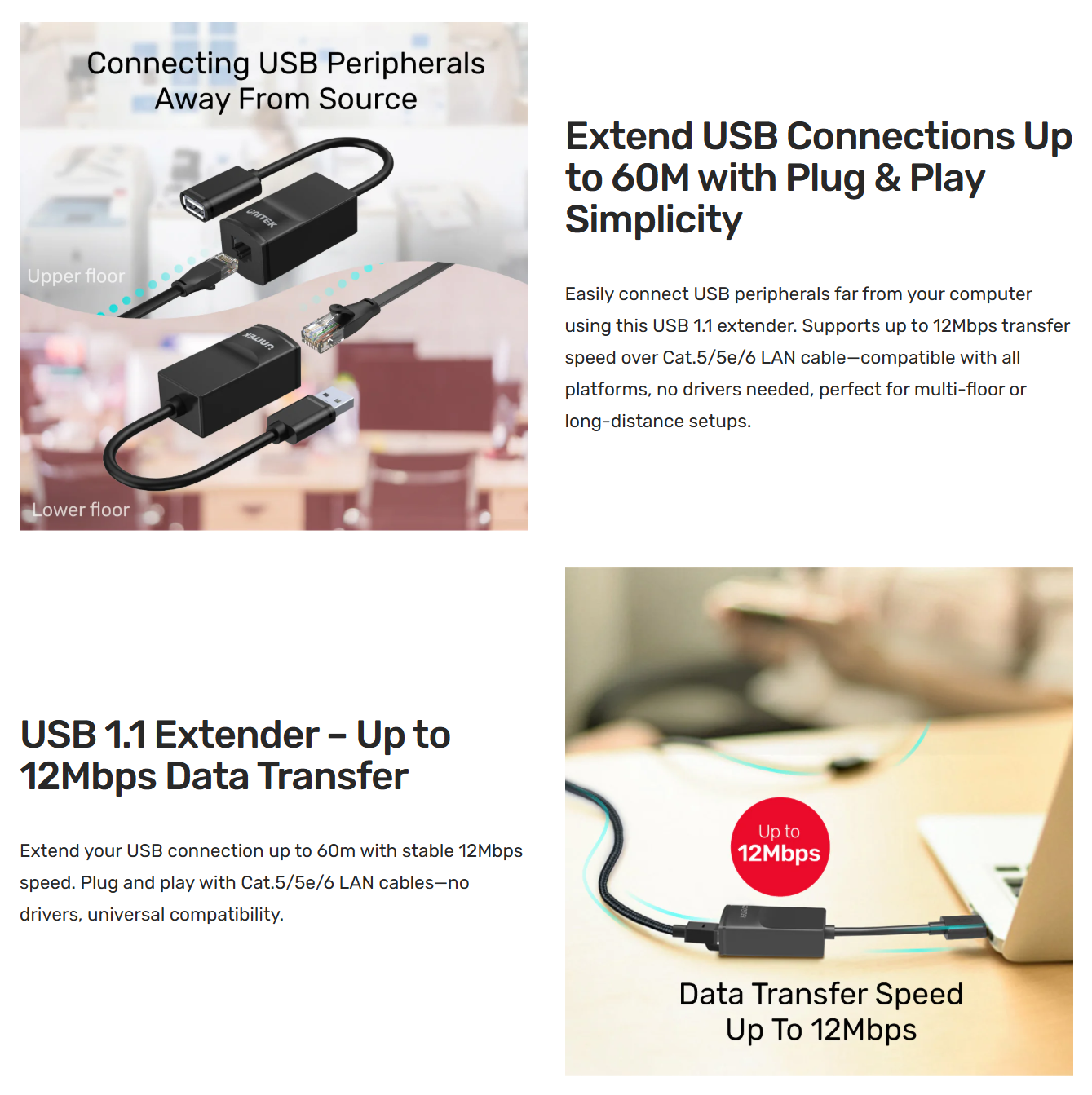 🔶UNITEK Y-UE01001 USB Extender Over CAT5 อุปกรณ์ขยายสัญญาณด้วยสาย LAN ของแท้ประกันศูนย์ 2ปี🔶