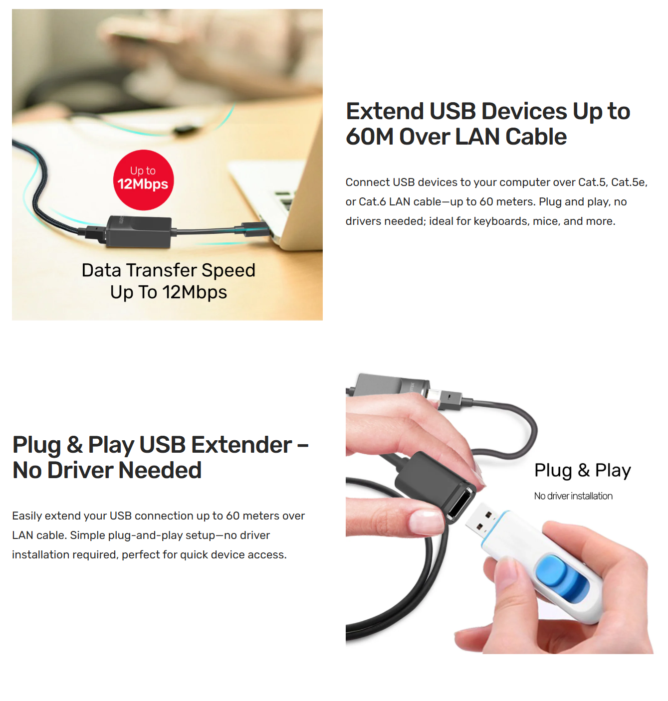 ✅ ใช้สายเคเบิล Cat.5, Cat.5e หรือ Cat.6 RJ45 LAN เพื่อขยายสัญญาณได้ไกลสูงสุด 60 เมตร