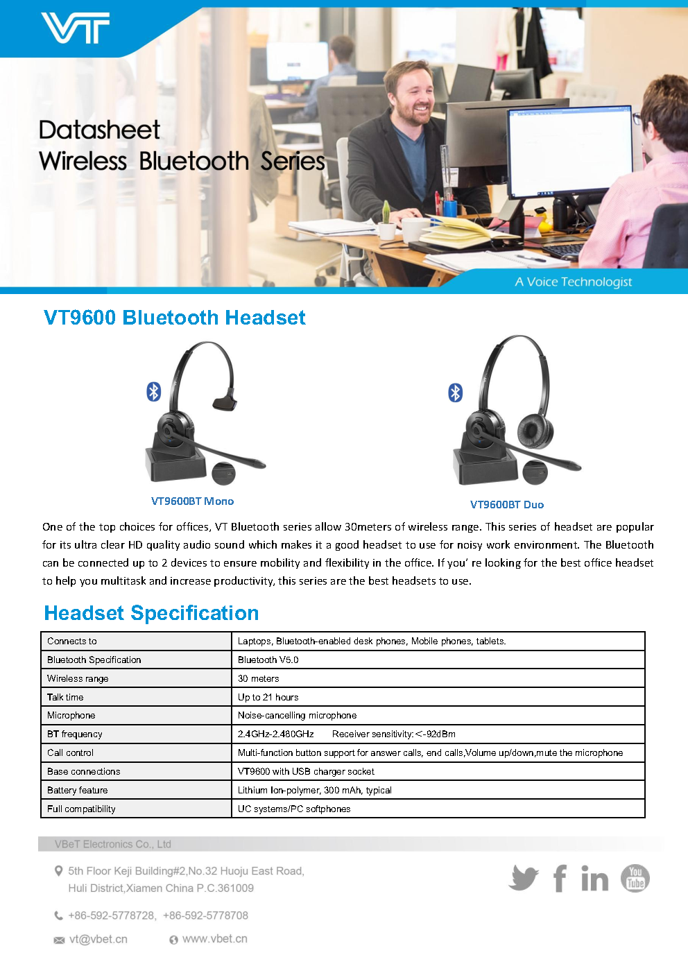 One of the top choices for offices, VT Bluetooth series allow 30meters of wireless range. This series of headset are popular for its ultra clear HD quality audio sound which makes it a good headset to use for noisy work environment. The Bluetooth can be connected up to 2 devices to ensure mobility and flexibility in the office. If you’ re looking for the best office headset to help you multitask and increase productivity, this series are the best headsets to use.