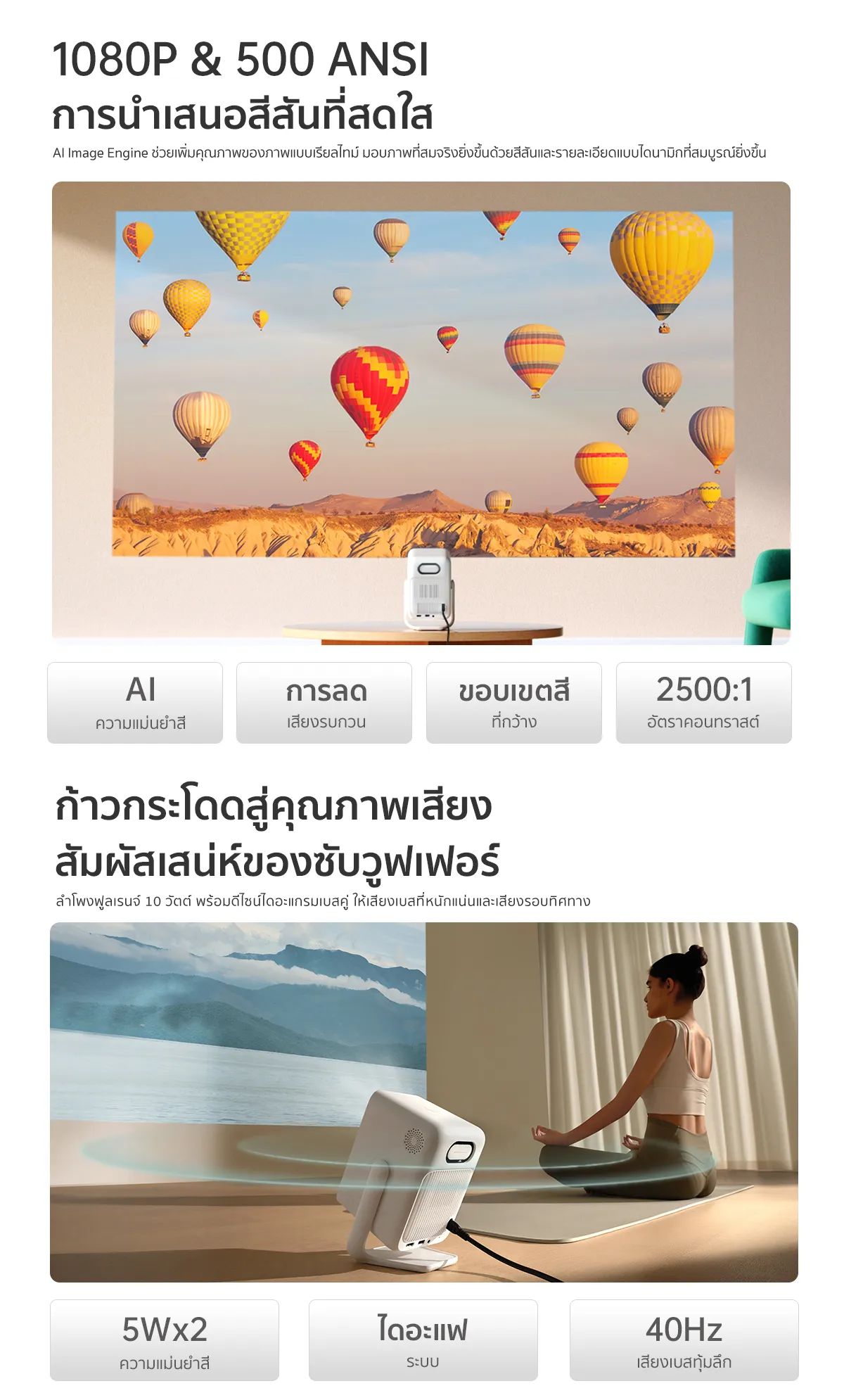 💠 1080P & 500 ANSI การนำเสนอสีสันที่สดใส Al lmage Engine ช่วยเพิ่มคุณภาพของภาพแบบเรียลไทม์มอบภาพที่สมจริงยิ่งขึ้นด้วยสีสันและรายละเอียดแบบไดนามิกที่สมบูรณ์ยิ่งขึ้น