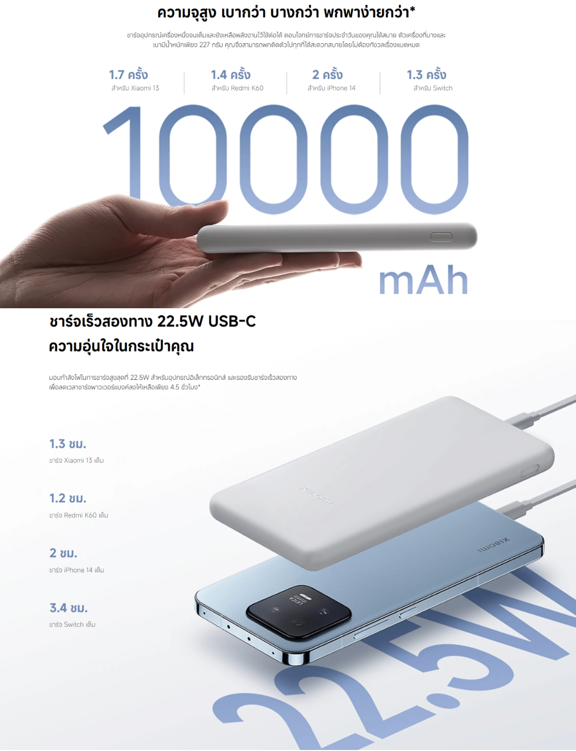 ชาร์จอุปกรณ์เครื่องหนึ่งจนเต็มและยังเหลือพลังงานไว้ใช้ต่อได้ ตอบโจทย์การชาร์จประจำวันของคุณได้สบาย ตัวเครื่องที่บางและเบามีน้ำหนักเพียง 227 กรัม คุณจึงสามารถพกติดตัวไปทุกที่ได้สะดวกสบายโดยไม่ต้องกังวลเรื่องแบตหมด