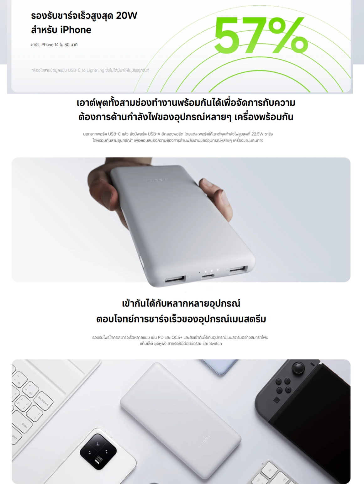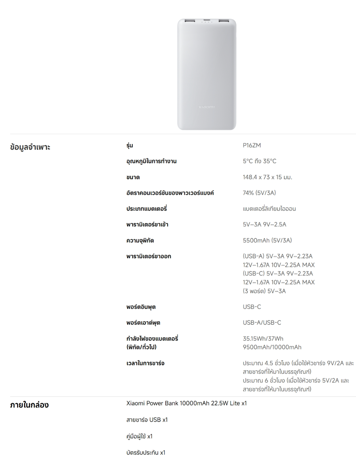 ◾ (USB-A) 5V⎓3A 9V⎓2.23A 12V⎓1.67A 10V⎓2.25A MAX (USB-C) 5V⎓3A 9V⎓2.23A 12V⎓1.67A 10V⎓2.25A MAX (3 พอร์ต) 5V⎓3A