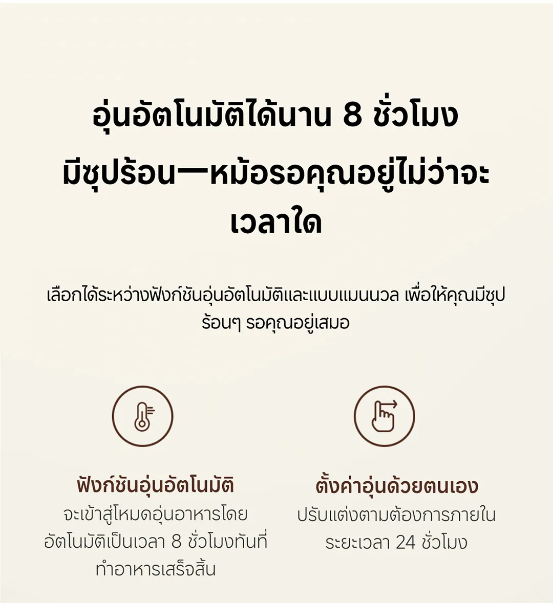 ✅ สามารถตั้งค่าอุ่นอาหารอัตโนมัติหลังทำเสร็จ 8 ชม. หรือตั้งเวลาเองภายใน 24 ชม.