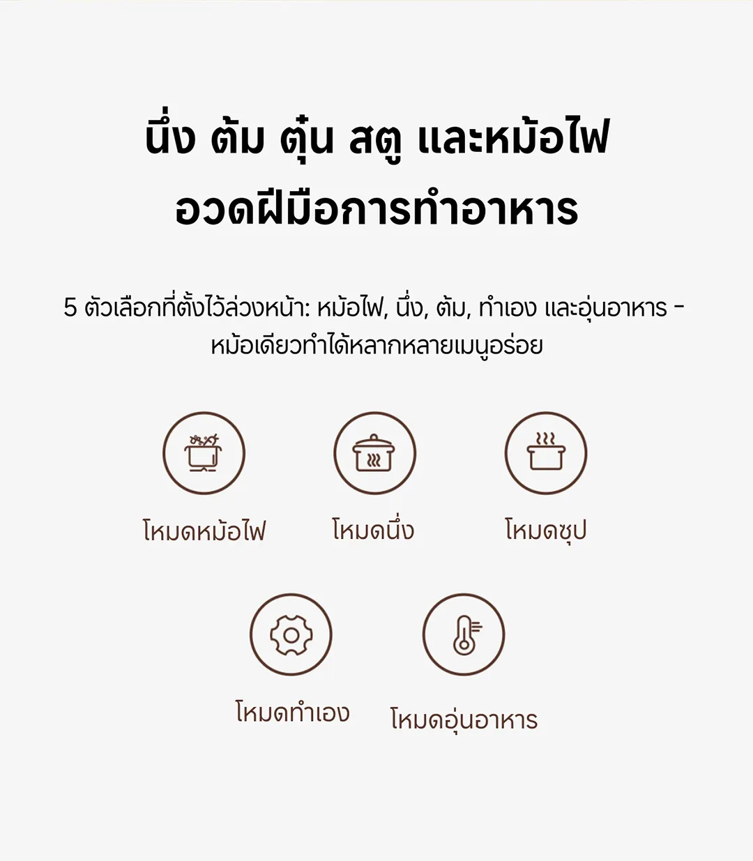 ✅ ปรับโหมดการใช้งานได้ 5 รูปแบบ โหมดหม้อไฟ โหมดนึ่ง โหมดซุป โหมดทำเอง โหมดอุ่นอาหาร
