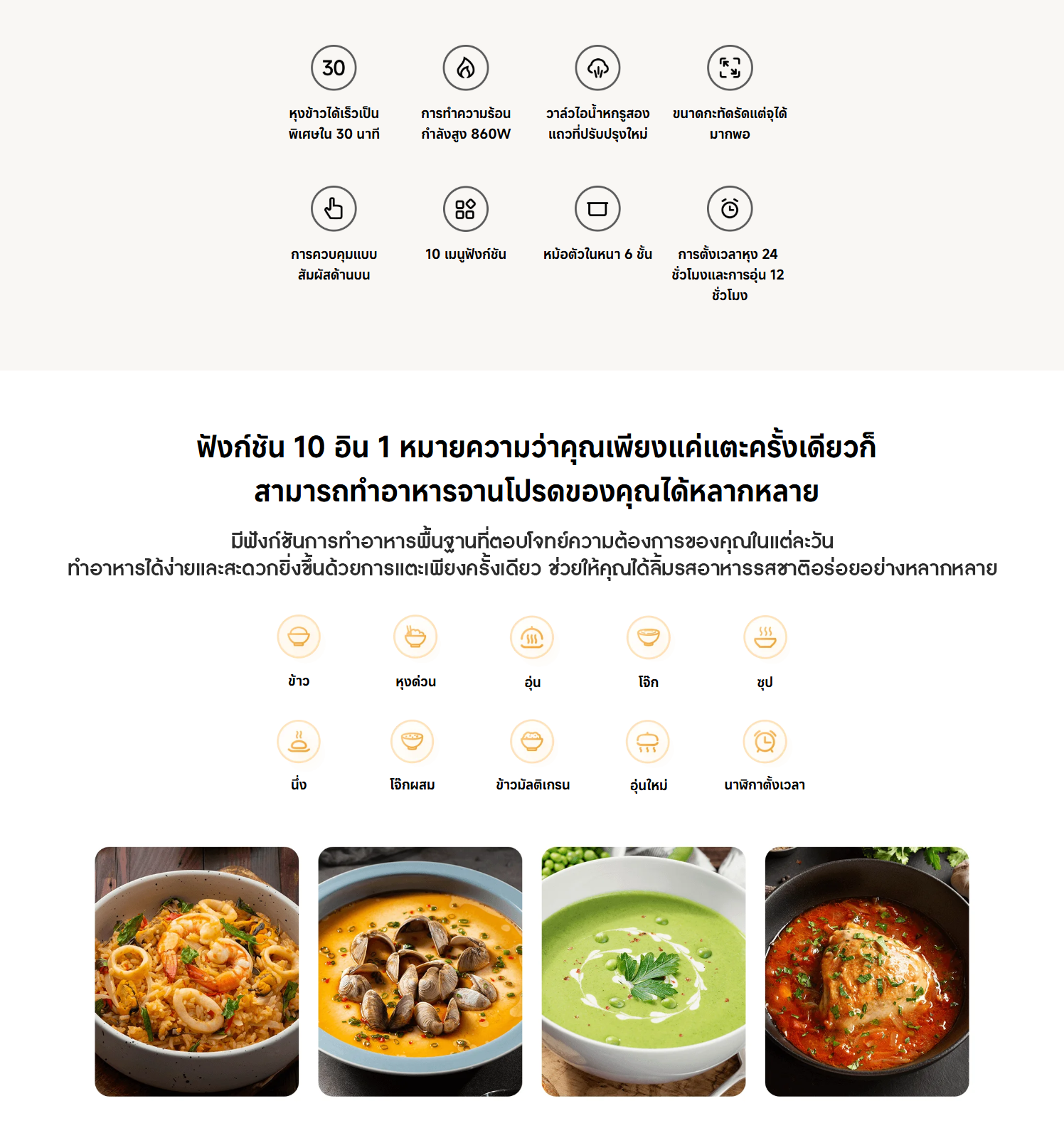 ✅ รองรับ 10 ฟังก์ชัน : หุงข้าว หุงด่วน อุ่น โจ๊ก ซุป นึ่ง โจ๊กผสม ข้าวมัลติเกรน อุ่นใหม่ ตั้งเวลา