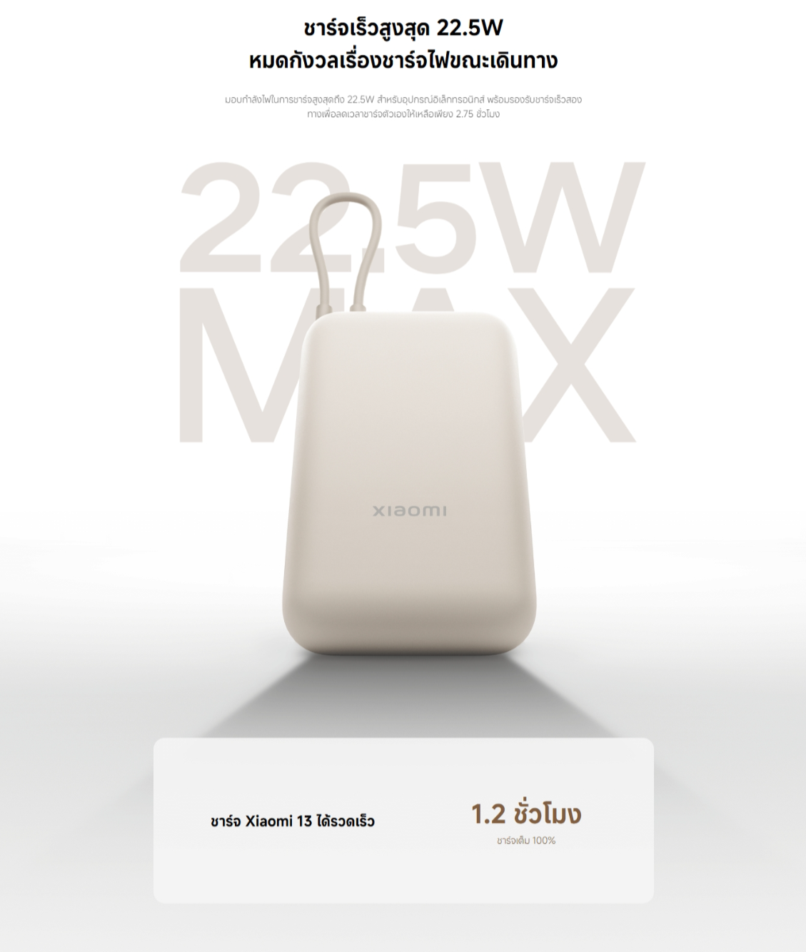 มอบกำลังไฟในการชาร์จสูงสุดถึง 22.5W สำหรับอุปกรณ์อิเล็กทรอนิกส์ พร้อมรองรับชาร์จเร็วสองทางเพื่อลดเวลาชาร์จตัวเองให้เหลือเพียง 2.75 ชั่วโมง