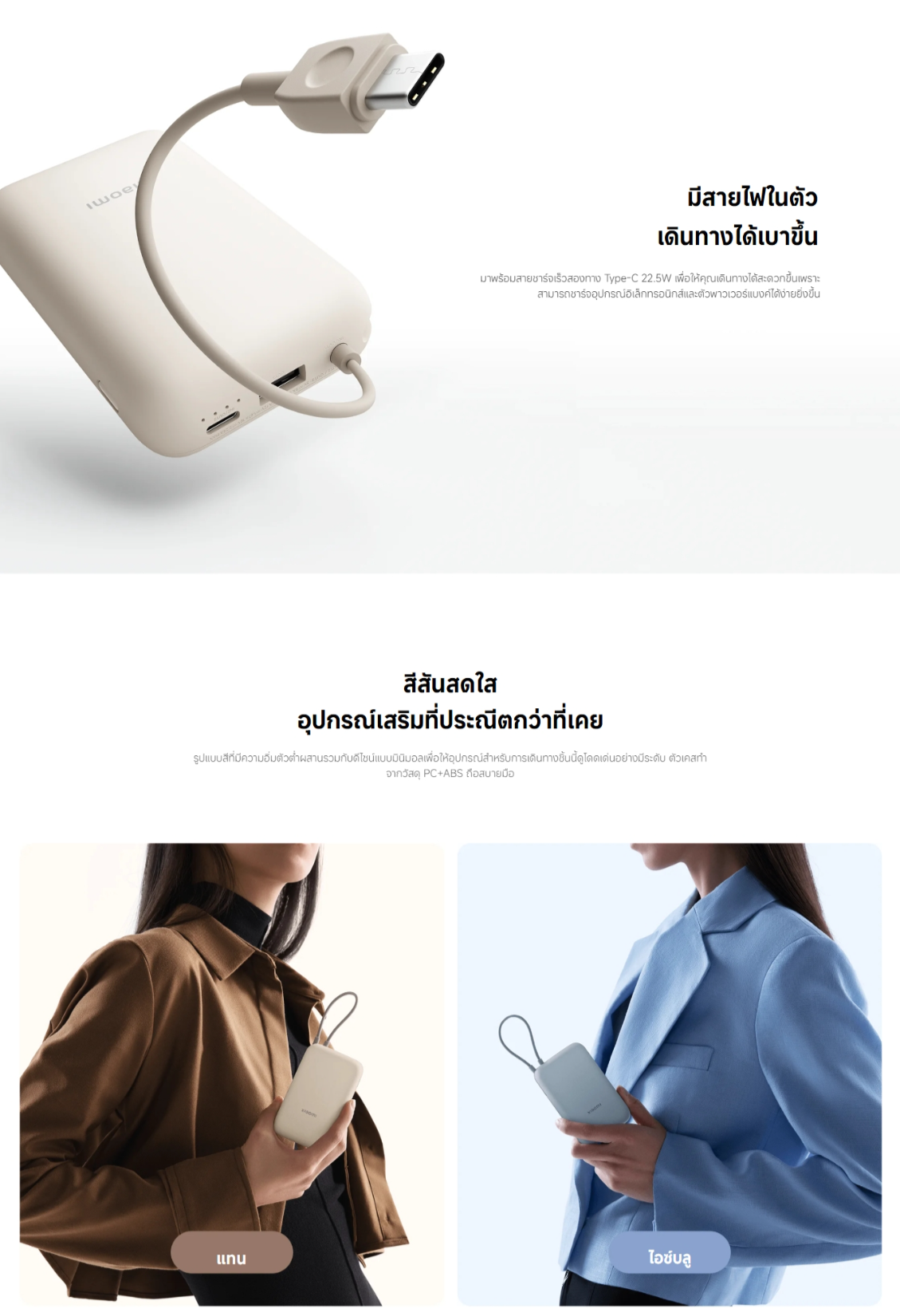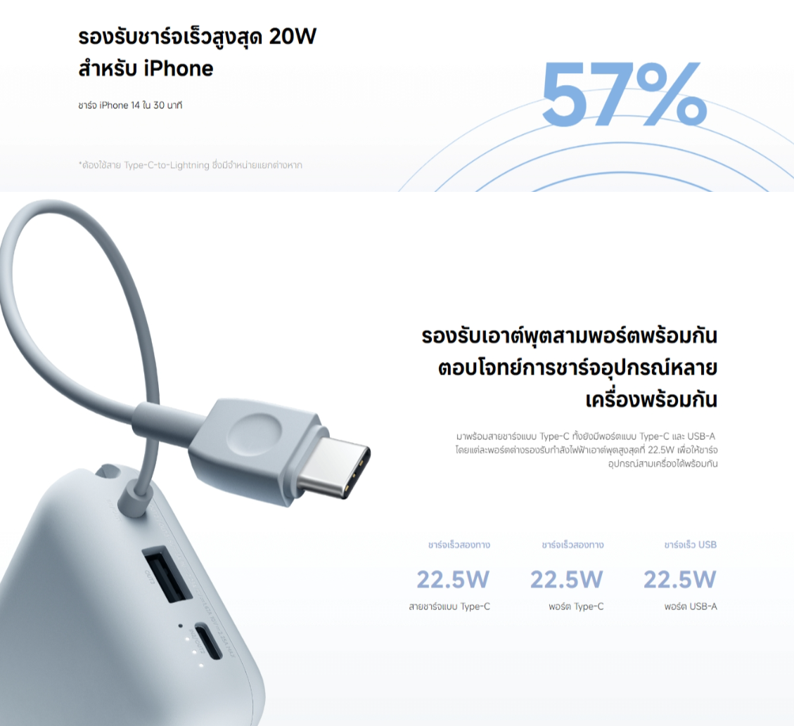 มาพร้อมสายชาร์จเร็วสองทาง Type-C 22.5W เพื่อให้คุณเดินทางได้สะดวกขึ้นเพราะสามารถชาร์จอุปกรณ์อิเล็กทรอนิกส์และตัวพาวเวอร์แบงค์ได้ง่ายยิ่งขึ้น