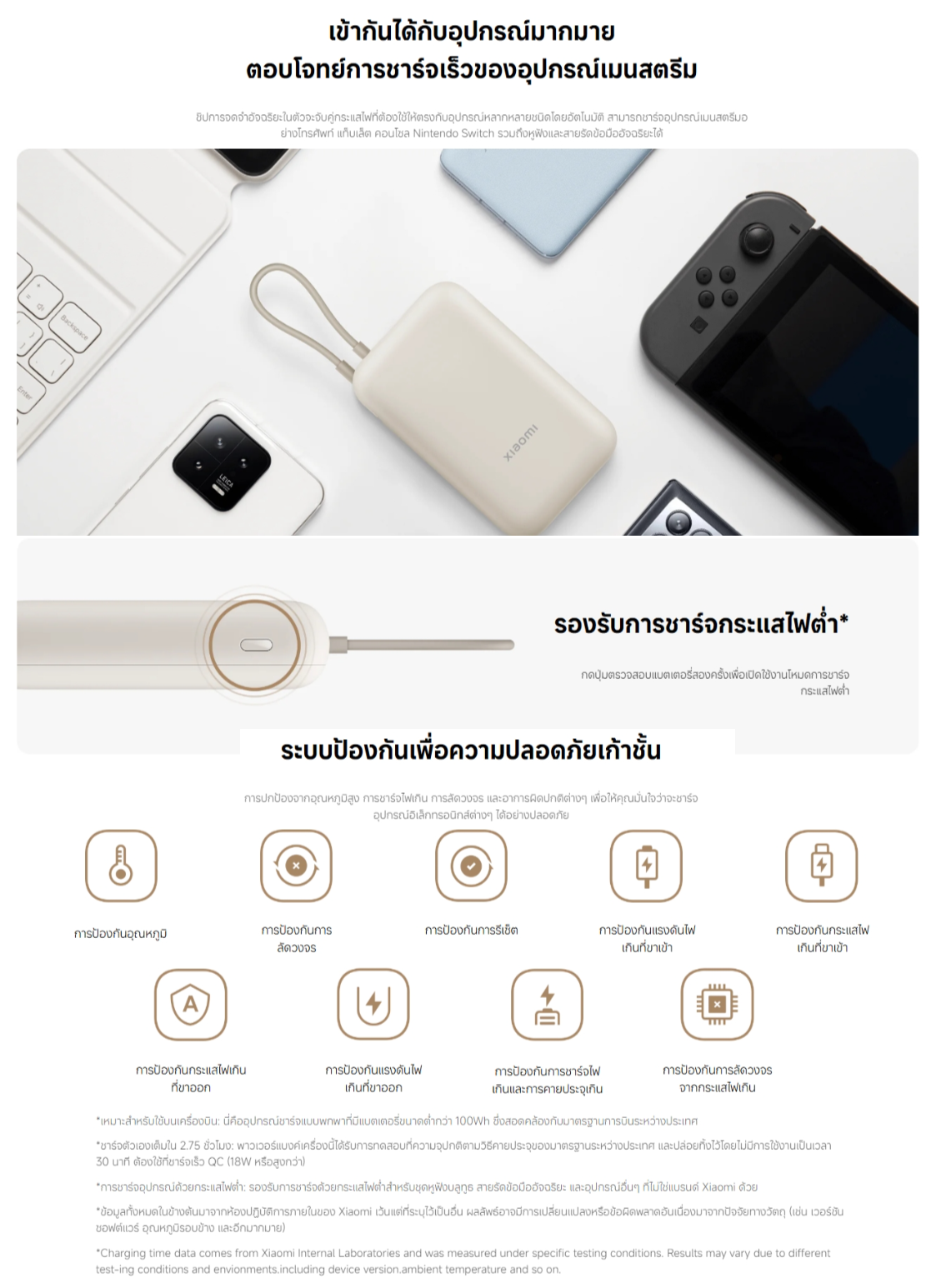 การปกป้องจากอุณหภูมิสูง การชาร์จไฟเกิน การลัดวงจร และอาการผิดปกติต่างๆ เพื่อให้คุณมั่นใจว่าจะชาร์จอุปกรณ์อิเล็กทรอนิกส์ต่างๆ ได้อย่างปลอดภัย