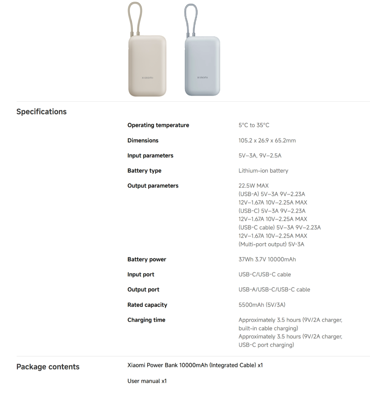 ◾ 22.5W MAX (USB-A) 5V⎓3A 9V⎓2.23A 12V⎓1.67A 10V⎓2.25A MAX (USB-C) 5V⎓3A 9V⎓2.23A 12V⎓1.67A 10V⎓2.25A MAX (USB-C cable) 5V⎓3A 9V⎓2.23A 12V⎓1.67A 10V⎓2.25A MAX (Multi-port output) 5V-3A