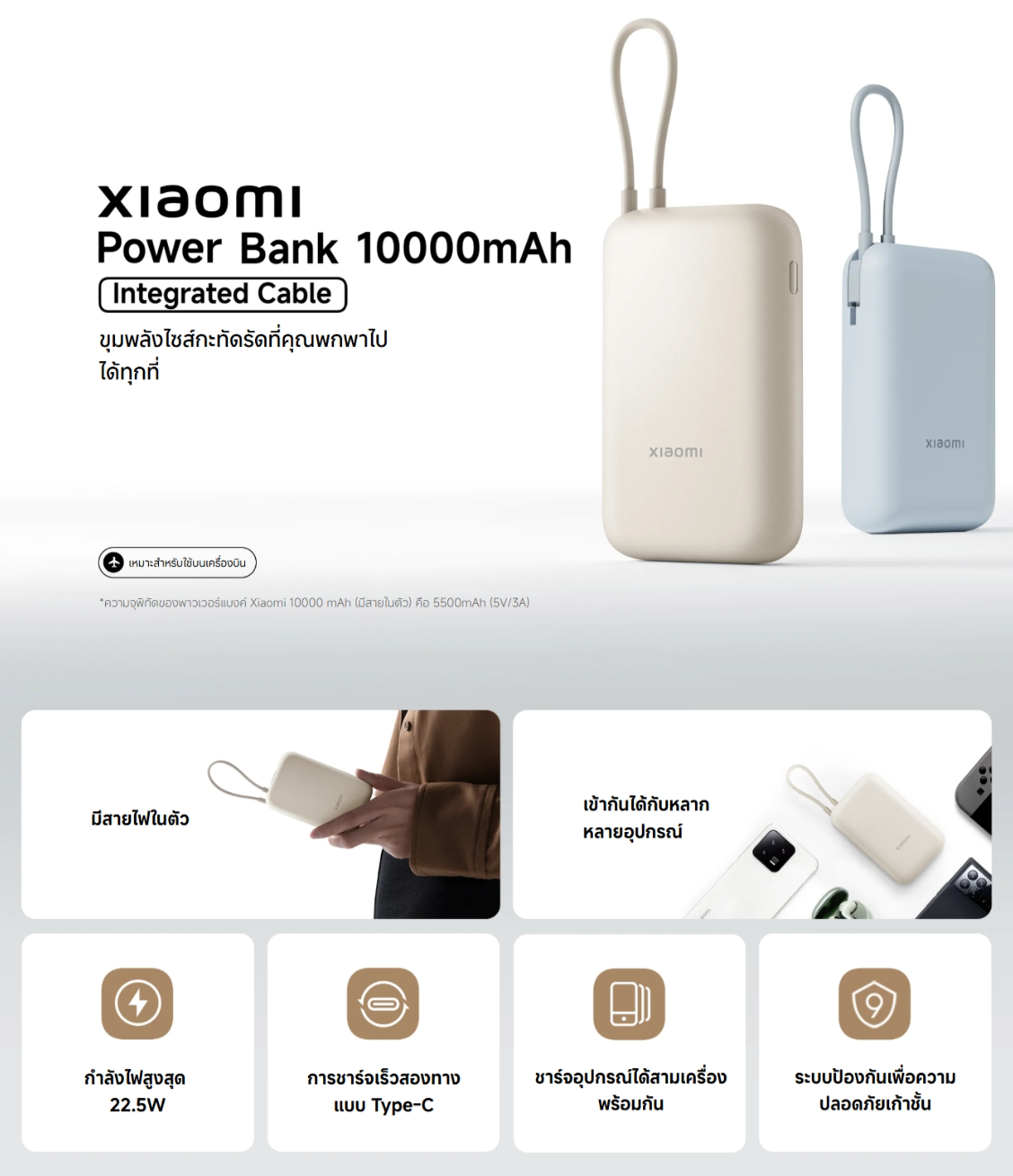 🔶Xiaomi Power Bank 10000mAh w/Cable พาวเวอร์แบงค์มีสายในตัว มีให้เลือก 2สี Blue(58526) | Tan(58615) ประกันศูนย์ 6 เดือน🔶