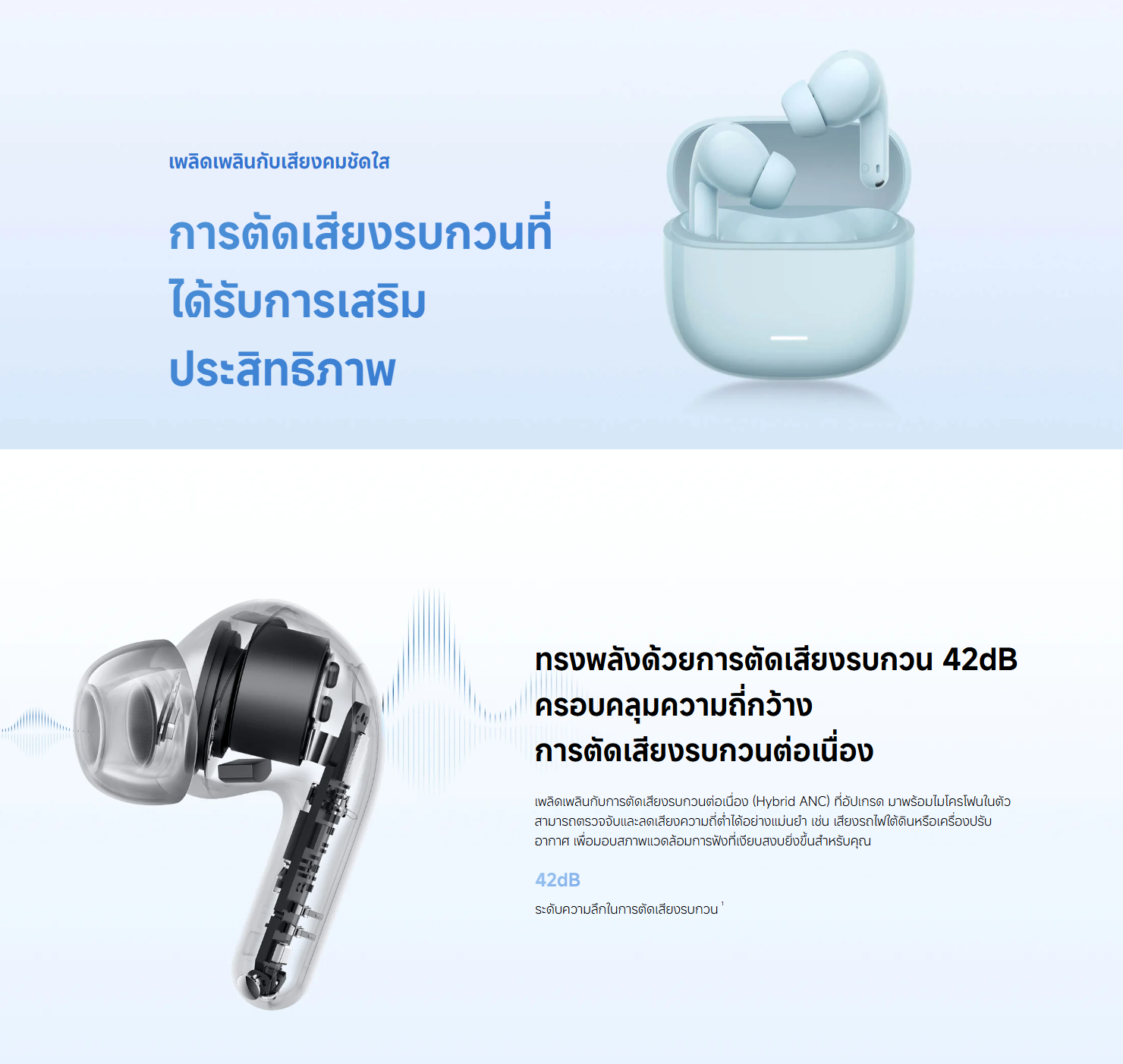✅ Hybrid ANC ตัดเสียงรบกวนแบบแอคทีฟสูงสุด 42dB พร้อมไมค์คู่สำหรับการโทรชัดเจน