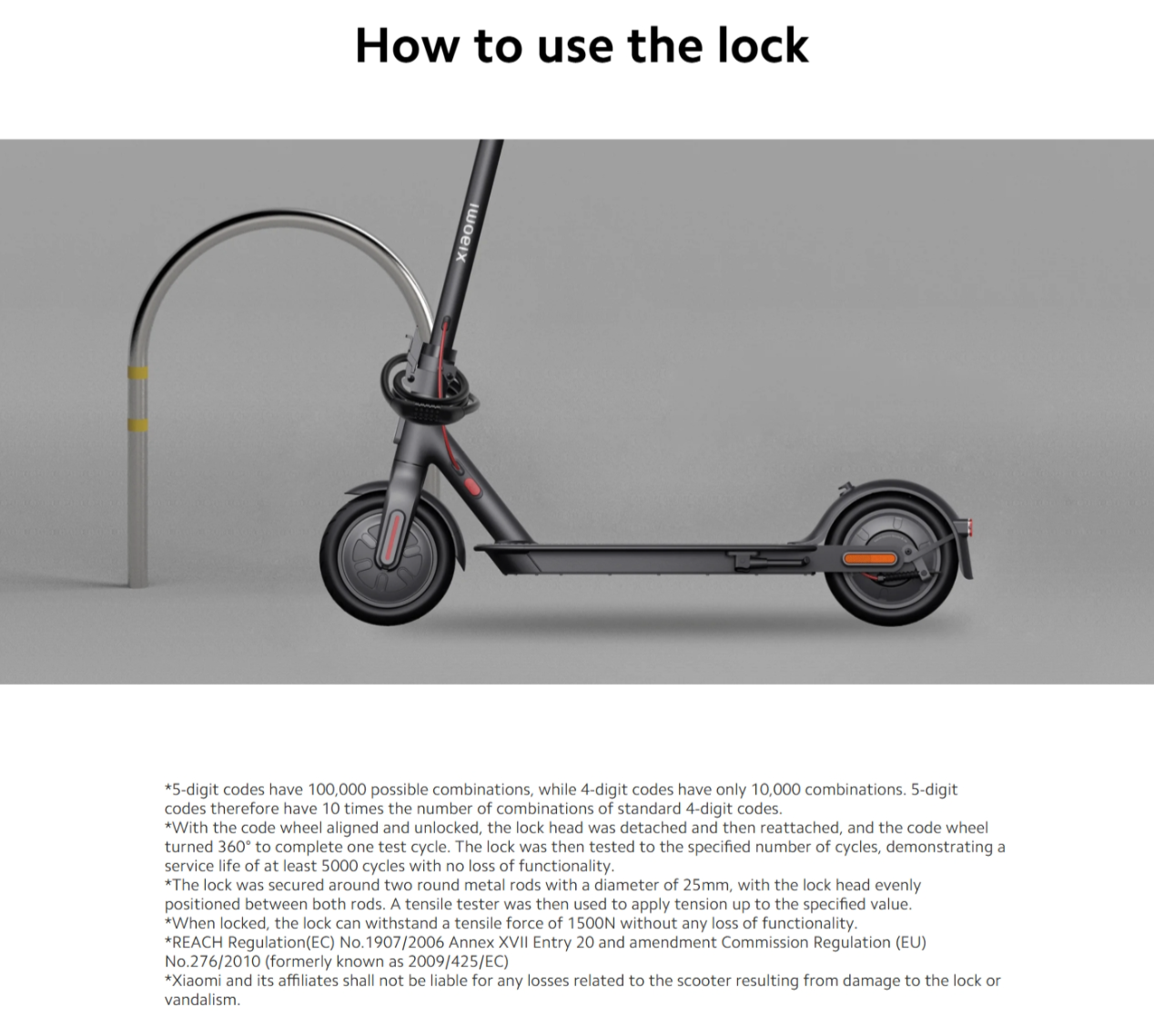 ล็อคนี้ออกแบบมาสำหรับ Xiaomi Scooter โดยเฉพาะ โดยมีดีไซน์เรียบง่าย กะทัดรัด น้ำหนักเบา พร้อมด้วยซับด้านนอกที่เป็นยางเพื่อความสะดวกสบายยิ่งขึ้น