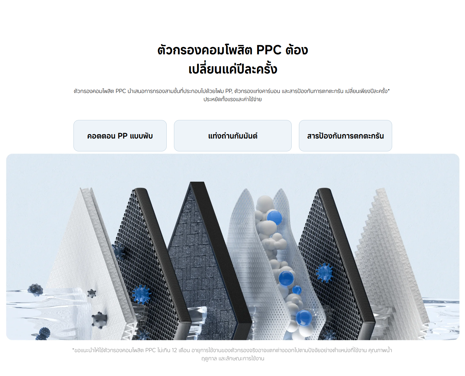 ✅ ตัวกรองคอมโพสิต PPC นำเสนอการกรองสามชั้นที่ประกอบไปด้วยโฟม PP, ตัวกรองแท่งคาร์บอน และสารป้องกันการตกตะกรัน