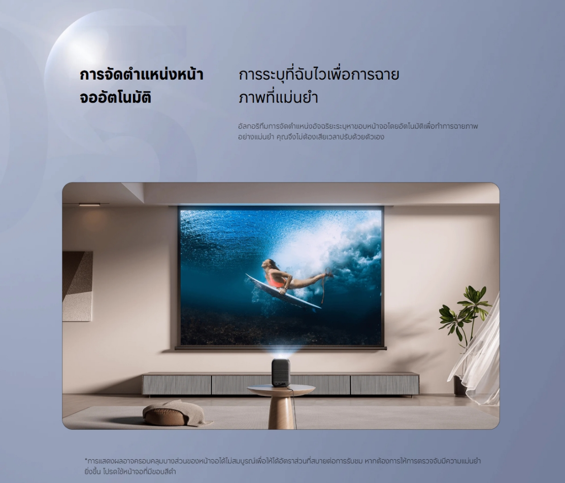มีอัลกอริทึม AI แก้ไขภาพสี่เหลี่ยมคางหมูที่ชาญฉลาดซึ่งสามารถแก้ไขภาพตามตำแหน่งการวางโปรเจคเตอร์ได้โดยอัตโนมัติ คุณจึงไม่ต้องคอยปรับเองบ่อยๆ ไม่ว่าจะฉายภาพจากด้านหน้า ด้านข้าง หรือจากเพดาน คุณก็จะได้ภาพรูปสี่เหลี่ยมผืนผ้าในทันที