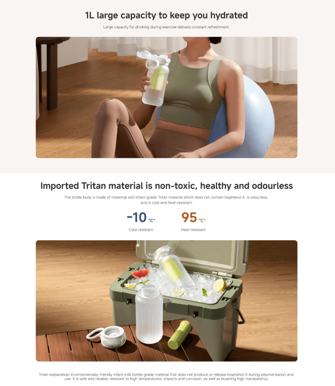 ตัวขวดทำจากวัสดุ Tritan เกรดแม่และเด็กซึ่งไม่ประกอบด้วยบิสฟีนอล เอ ไม่มีกลิ่น ทนต่อความเย็นและความร้อน