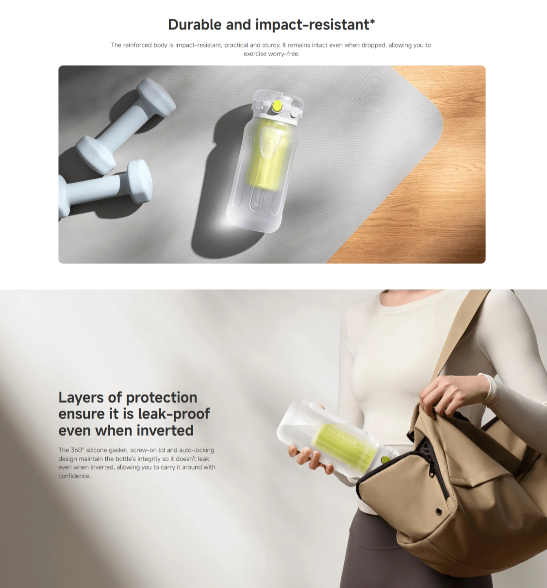 ปะเก็นซิลิโคน 360° ฝาหมุนเกลียว และการออกแบบล็อกอัตโนมัติ ช่วยรักษาความสมบูรณ์ของขวดไม่ให้รั่วซึมแม้จะคว่ำลง ช่วยให้คุณพกพาไปไหนมาไหนได้อย่างมั่นใจ
