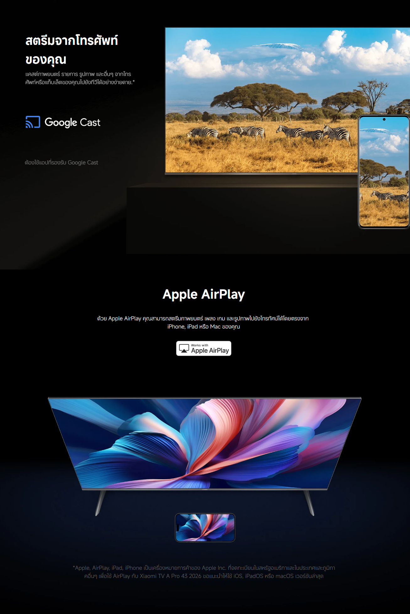*Apple, AirPlay, iPad, iPhone เป็นเครื่องหมายการค้าของ Apple Inc. ที่จดทะเบียนในสหรัฐอเมริกาและประเทศและภูมิภาคอื่นๆ สำหรับการใช้งาน AirPlay กับ Xiaomi TV A Pro 43UHD 2026 แนะนำให้ใช้ iOS, iPadOS หรือ macOS เวอร์ชันล่าสุด