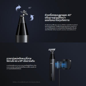 หัวเครื่องแต่งขนที่ยืดหยุ่น ออกแบบมาให้ปรับตามส่วนโค้งเว้าของใบหน้าและลำคอคุณโดยเฉพาะ หัวเครื่องแต่งขนแบบลูกลอยสามารถหักทำมุม 40 องศาได้ทั้งสองทิศทาง และยังปรับได้อย่างยืดหยุ่นเพื่อการโกนอันแม่นยำที่ช่วยในการโกนตามแนวแก้ม ขอบกราม จอน และอีกมากมาย