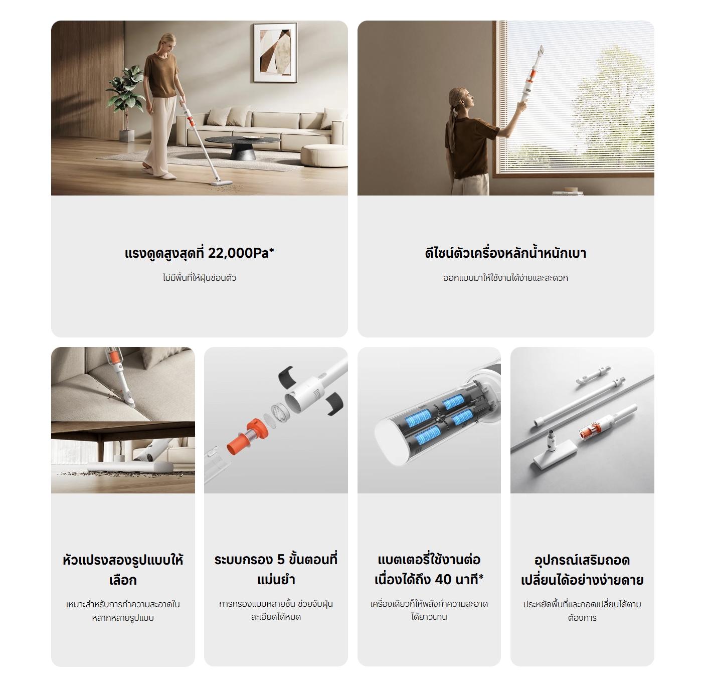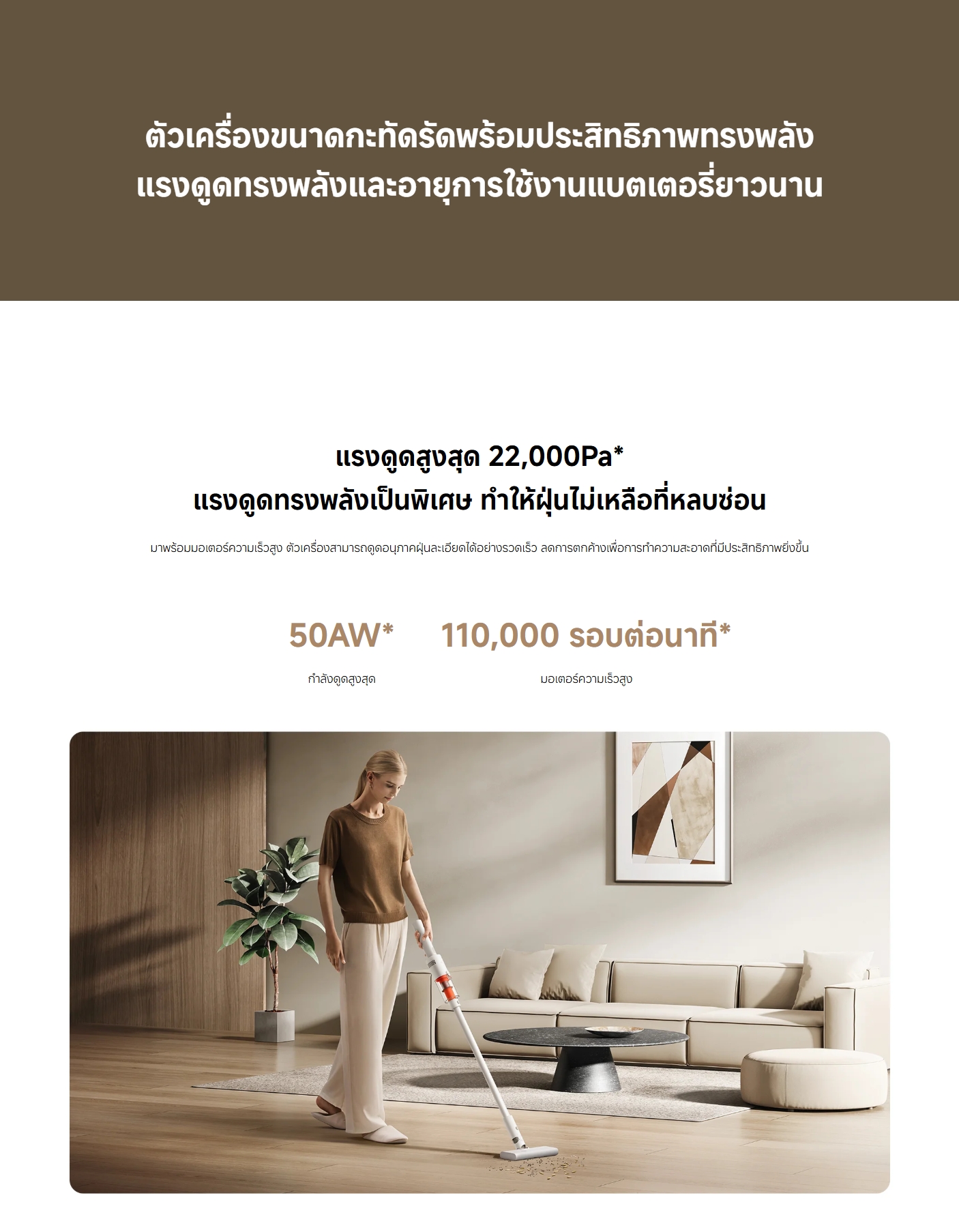 ✅ แรงดูดสูงสุด 22,000Pa / 50AW ความเร็วรอบมอเตอร์สูง 110,000 รอบต่อนาที
