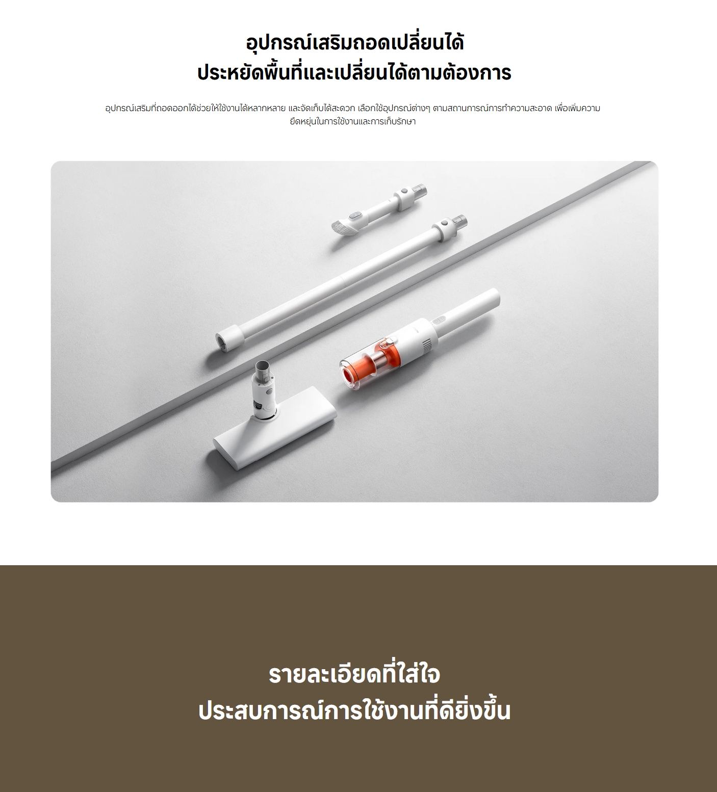 ✅ อุปกรณ์เสริม ก้านต่อ (สำหรับตัวเครื่องและหัวแปรง), แปรงหลัก, หัวดูด 2-in-1 crevice brush
